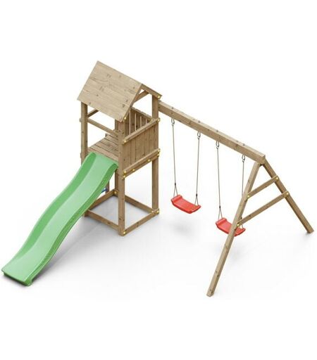 Amusez et faites plaisir à vos enfants avec ce portique en bois AMBROISE ! Il comprend 2 balançoires, un toboggan et une plateforme disposée devant le toboggan à 1.10m du sol. La plateforme est surmontée d’une maisonnette pour apporter plus de rires et rendre l’ensemble plus chaleureux. L’échelle et ses barreaux métalliques permettront d’y accéder facilement. Robuste et complète, cette aire de jeux d’extérieur peut accueillir au maximum 6 personnes de 50kg et saura provoquer de nouvelles sensations d’amusements à vos enfants. Cette aire de jeux de plein air en pin Sylvestre traité autoclave a été mise au point en respectant la gestion durable des forêts et possède le label FSC. Produit conçu dans le respect de la norme européenne EN71. Les + produit : Aire de jeux en bois (Pin Sylvestre), traité autoclave classe 3 Comprend 2 balançoires et un toboggan avec plateforme surmontée d’une maisonnette. Respecte la norme de sécurité européenne EN71 Caractéristiques techniques : Dimensions ...