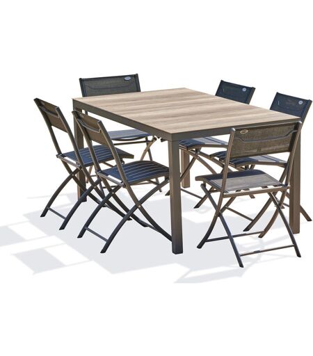 Ensemble repas composé d'une table en aluminium gris anthracite avec plateau en polywood imitation bois et de 6 chaises de jardin pliantes et légères en aluminium et textilène gris anthracite avec barre à l'arrière du dossier pour ètre déplacée facilement. DIMENSIONS Chaise : L 46 x l 40 x H 82 cm Hauteur sol-assise : 42 cm Assise : L 40,5 x P 37,5 cm Chaise pliée : L 96 x l 46 x H 17 cm ...