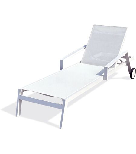 Bain de soleil à roulettes en toile plastifiée blanche avec structure en aluminium blanc. Bain de soleil à roulette avec accoudoirs et dossier réglable 5 positions. DIMENSIONS L 210 x l 75 x H 50 cm Hauteur sol- assise : 30 cm Hauteur sol- accoudoir : 50 cm Hauteur du dossier relevé : 98 cm ...