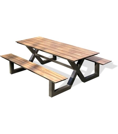 Table de jardin en aluminium gris anthracite, composée de 2 bancs et d'un grand plateau 5 lames en HPL effet bois. DIMENSIONS Total : L 210 x l 174 x H 75 cm Au sol : L 160 x l 152 x H 75 cm Plateau de table : L 210 x l 80 x H 1,2 cm Banc : L 210 x 31,5 cm Pied : 8 x 8 cm Epaisseur aluminium : 0,5 cm ...