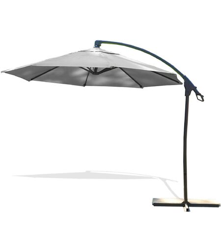 Parasol déporté avec toile octogonale imperméabilisée en polyester gris. Mât en aluminium gris. Ouverture simple par manivelle. Pieds en acier pré-percés, fixation au sol obligatoire. Dalles de parasol vendues séparément DIMENSIONS L 300 x l 300 x H 265 cm Mât : 4 x 4,1 x 0,12 cm ...