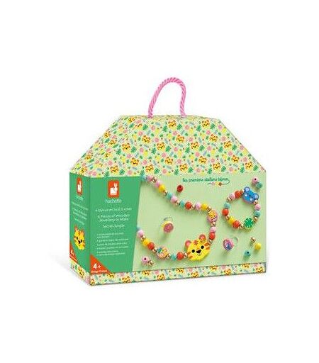 ? Le premier atelier bijoux des tout-petits, d?s 4 ans. ? 4 bijoux en bois ? assembler, th?me animaux de la jungle. ? La bo?te se change en petit sac pour ranger ses bijoux !. Voil? de beaux bijoux en bois ! Avec ce kit cr?atif, les enfants ? partir de 4 ans vont r?aliser facilement une jolie parure : 2 bagues, 1 collier et 1 bracelet. Sur le th?me de la jungle, ces 4 bijoux en bois sont aussi agr?ables ? cr?er qu'? porter pour les tout-petits ! Fabriquer des bijoux avec des perles permet aux enfants de d?velopper leur motricit? fine et leur cr?ativit?, ils apprennent aussi ? r?aliser des suites de couleurs ou par taille, pour des bijoux du plus bel effet. Ce coffret de loisir cr?atif contient : 2 perles en bois silhouett?es et imprim?es, 3 perles en bois rondes et imprim?es, 33 perles en bois rondes et color?es, 22 perles en bois dor?es, 2 bagues avec perles en bois plates et imprim?es, 1 planche de 8 strass et 1 fil ?lastique. Un livret avec les mod?les et les instructions est inclus, pour une activit? autonome ou accompagn?e d'un adulte. Le bois est robuste et tr?s agr?able ? porter, les imprim?s vitamin?s et les perles dor?es donnent aux bijoux une certaine personnalit?. L'autre atout de ce coffret cr?atif, c'est sa bo?te super sympa ! En effet, elle devient un joli petit sac dans lequel on peut ranger ses bijoux, mais aussi tous ses tr?sors et ses secrets. Alors, parez-vous de vos plus beaux bijoux en perles et percez les myst?res de la jungle ! ...