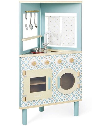 Avis aux apprentis cuisiniers !! Cette cuisine est faite pour vous !! Elle possède toutes les fonctionnalités désirées. En plus d'être compacte (s'utilise en ilot et peut se ranger dans un coin), elle possède un évier intégré, un four et un lave- linge sur la façade principale, ainsi qu'un placard sur les 2 autres côtés. Chaque placard possède un système d'étagère astucieux. Des boutons bruiteurs rotatifs complètent la façade avant. Cette jolie cuisine est livrée avec 5 accessoires métal (1 poêle et 4 ustensiles de cuisine). Hauteur du plan de travail : 51.3 cm. Permet de développer l'imagination de votre enfant et des moments de partage en famille. Jouet d'imitation en bois pour les enfants, à partir de 3 ans. Nous avons imaginé cette cuisine TRIO aux beaux volumes, pour de petits espaces. Sa forme unique et maline permet aux enfants de jouer tout autour, et offre aux parents la possibilité de lui trouver facilement une place dans un coin ! De jolis motifs carreaux de ciment et des couleurs douces, indispensables pour coller aux tendances actuelles ! ...