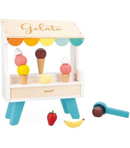 ? Magn?tique, avec 14 accessoires pour des cr?ations rafraichissantes !. ? Pour imiter les grands et inventer plein d'histoires, d?s 3 ans. ? Les enfants pr?sentent leurs parfums pr?f?r?s ? l'avant du stand : c'est ouvert !. Plut?t glace ? la vanille ou cornet ? la fraise ? Goutez tous les parfums avec ce stand de glaces en bois ! Id?al pour les enfants d?s 3 ans, ce jouet d'imitation rafraichissant promet de beaux moments de partage autour de d?licieux cornets glac?s. Il y a tout le n?cessaire pour satisfaire les gourmands : 3 c?nes, 6 boules de couleurs diff?rentes, ainsi que des fruits et de la cr?me chantilly pour toujours plus de fantaisie ! Au total, 14 accessoires aimant?s sont inclus : pratique pour ne pas faire tomber le contenu de son cornet. Toujours plus malin, la cuill?re fournie est ?galement magn?tique et permet ? nos petits vendeurs d'attraper facilement les boules de glace ! Une fois le client satisfait, on suspend la cuill?re sur le c?t? de la marchande. Avec 6 emplacements pour pr?senter les glaces pr?tes ? emporter, le stand dispose aussi d'un espace de rangement ? l'arri?re. Avec cette marchande en bois, les petits jouent au glacier et imitent les plus grands, pour le plus grand bonheur de toute la famille ! Ce petit stand se pose facilement sur une table et favorise ainsi des moments de partage ? plusieurs : il y en aura pour tout le monde ! Ce jouet d'imitation gourmand ? souhait stimule aussi l'imagination des petits : et si la glace ? la fraise ?tait finalement go?t bubble gum ? Il faut aussi ?tre minutieux pour empiler soigneusement les ?l?ments et faire preuve de cr?ativit? pour imaginer les compositions les plus attrayantes. Le stand est vendu avec tous ses accessoires et l'ensemble est fabriqu? en bois FSC?. ...