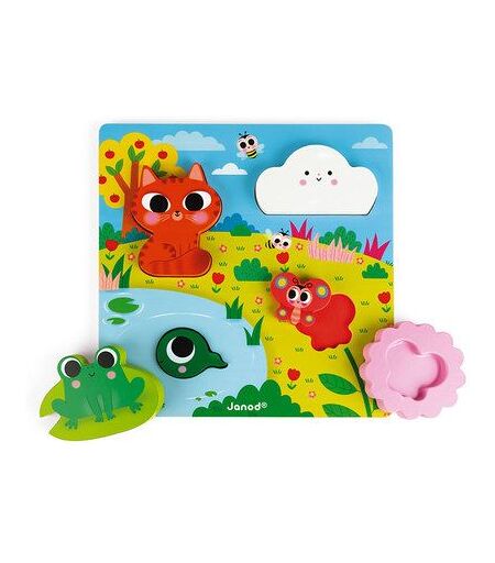 Découvrez ce puzzle composé de 6 pièces colorées, idéal pour accompagner bébé dans le développement de sa motricité. ; Mais où sont-ils cachés ? Le têtard et le papillon adorent jouer à cache-cache. Soulève les pièces pour vite les retrouver ! Votre enfant  pourra; jouer avec les pièces comme de vraies figurines, car elles tiennent debout. Tout en s'amusant, votre enfant développera sa motricité et son imagination.; ; Caractéristiques produit : Puzzle composé de 6 pièces. Display de 4 puzzles. ; Bois : Contreplaqué pour le plateau et MDF; pour les pièces. Fonds couleurs assortis. Impression : Transfert à chaud. ; ...