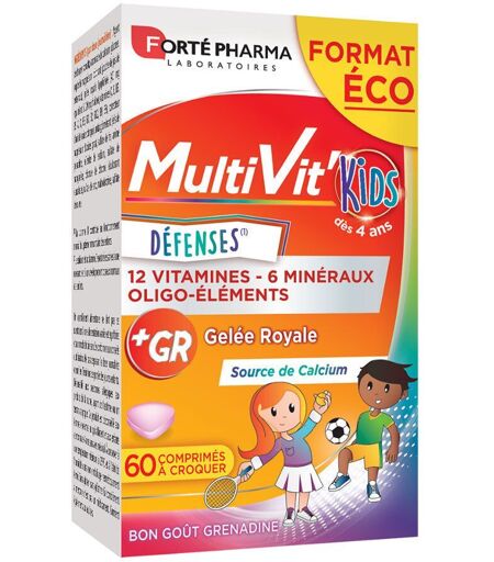 Complément alimentaire à utiliser dans le cadre d’une alimentation variée, équilibrée et d’un mode de vie sain. MultiVit 4G Kids aide à couvrir les besoins quotidiens des enfants de 4 ans et plus en vitamines, minéraux, et oligo-éléménts et à renforcer leurs défenses immunitaires. Avec MultiVit’Kids, vous aidez vos enfants à tenir le rythme intense de leur vie quotidienne. Sa formule, conçue pour leur apporter les micro-nutriments indispensables à leur croissance, les aidera à maintenir leurs défenses immunitaires. Une formule optimale pour recharger l’organisme : 12 vitamines pour aider à couvrir leurs besoins journaliers ; 6 minéraux et oligo-éléments essentiels au bon fonctionnement de leur organisme et à leur croissance ; de la Gelée Royale, véritable concentré nutritif. La MultiVit’Kids est notamment source de calcium, puisque 2 comprimés apportent 30% des valeurs nutritionnelles recommandées. Grâce à ses comprimés faciles à croquer au bon goût grenadine, MultiVit’Kids plaira à tous les enfants de 4 à 10 ans. L’idéal donc pour que vos enfants puissent profiter pleinement de leurs journées ! Bénéfices La gelée royale : un ingrédient phare Produit phare parmi les produits de la ruche, la gelée royale est une véritable source nutritive naturelle. De quoi booster les défenses immunitaires De la vitamine D qui contribue au fonctionnement normal du système immunitaire des enfants De quoi assurer la croissance de vos enfants De la vitamine D et du calcium. Le calcium et la vitamine D sont nécessaires à une croissance et à un développement osseux normaux des enfants. Des micro-nutriments indispensables au bon fonctionnement de l’organisme des enfants Du fer qui contribue au développement cognitif normal des enfants Composition: Charge (isomalt), carbonate de calcium, glucose, oxyde de magnésium, colorant (poudre de jus de betterave), gelée royale lyophilisée (40 mg équivalent à 120 mg de gelée royale fraîche), vitamines (C, E, B3, B5, A, D, B6, B1, B2, B12, B9, B8), régulateur d'acidité (acide citrique), anti-agglomérant (sels de magnésium d'acides gras), sulfate de fer, arôme de grenadine, sélénite de sodium, sulfate de manganèse, chlorure de choom, édulcorant (sucralose), sulfate de zinc, maltodextrine, sulfate de cuivre. Valeur nutritionnelle: Pour 1 comprimé AJR* Vitamine A 400 µg 50 % Vitamine B1 0,90 mg 80 % Vitamine B2 1,06 mg 74 % Vitamine B3 11,88 mg 74 % Vitamine B5 3,96 mg 66 % Vitamine B6 1,4 mg 100 % Vitamine B8 50 µg 100 % Vitamine B9 200 µg 100 % Vitamine B12 1 µg 40 % Vitamine C 30 mg 36 % Vitamine D 5 µg 100 % Vitamine E 10 mg 82 % Calcium 240 mg 30 % Chrome 25 µg 62 % Fer 4,2 mg 30 % Magnésium 114 mg 30 % Manganèse 1 mg 50 % Sélénium 25 µg 44 % Gelée Royale 240 mg *Apport journalier de reference Conseil d'utilisation: Il est conseillé de prendre: Pour les enfants de 4 à 10 ans 1 comprimé par jour à croquer le matin sur une durée de 30 jours. Pour les enfants à partir de 10 ans et les adultes 2 comprimés par jour à croquer le... ...