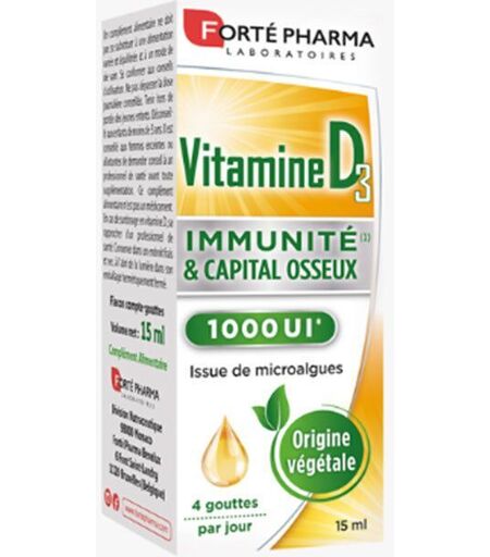 Complément alimentaire à utiliser dans le cadre d’une alimentation variée, équilibrée et d’un mode de vie sain.La synthèse de la vitamine D se fait au niveau de votre peau lors d'une exposition aux rayons UV mais pas que ! Elle passe également par l'alimentation.Malgré tout, les sources alimentaires de vitamine D sont limitées (poissons gras) et un manque d'exposition solaire peut également jouer en sa défaveur, c'est pourquoi il est parfois recommandé de se supplémenter en vitamine D.Pour cette raison, il été développé pour vous Vitamine D3 1000 UI avec une vitamine D d'origine végétale issue de micro-algues.Une facilité d'absorption Vitamine liposoluble, elle été mélangé à de l'huile de colza pour une absorption et une action optimale sur votre système immunitaire.Cette Vitamine D3 vous procure deux actions complémentaires : elle contribue au fonctionnement normal du système immunitaire elle contribue au maintien d'une ossature normaleHautement dosée pour vous apporter un maximum de bienfaitsCette Vitamine D3 est hautement dosée : 1 goutte vous apporte 250 UI.Il est conseillé de prendre 1 à 4 gouttes par jour pour atteindre les 1000 UI.**1000 UI de vitamine D correspondent à 25μg (dose journalière maximale recommandée)IngrédientsHuile de colza, cholécalciférol (vitamine D3), antioxydant (extrait riche en tocophérols).Valeurs nutritionnelles Pour 4 gouttes AJR*Vitamine D325 µg500 %*Apport journalier de référence Conseils d'utilisation1 à 4 gouttes pour les adultes et 1 à 2 pour les enfants dès 3 ans.1 fois par jour, pure ou dans un yaourt.Précautions d'emploi:Précautions d'emploiNe pas dépasser la dose journalière conseillée. Tenir hors de portée des jeunes enfants. Déconseillé aux enfants de moins de 3 ans. Il est conseillé aux femmes enceintes ou allaitantes de demander conseil à un professionnel de santé avant toute supplémentation. Ce complément alimentaire n’est pas un médicament. En cas de surdosage en vitamine D, se rapprocher d'un professionnel de santé.Conserver dans un endroit frais et sec, à l’abri de la lumière dans son emballage hermétiquement fermé.Poids net15 mlAdresse du FabricantForté Pharma 6 Font Saint-Landry 1120 Bruxelles Belgique ...