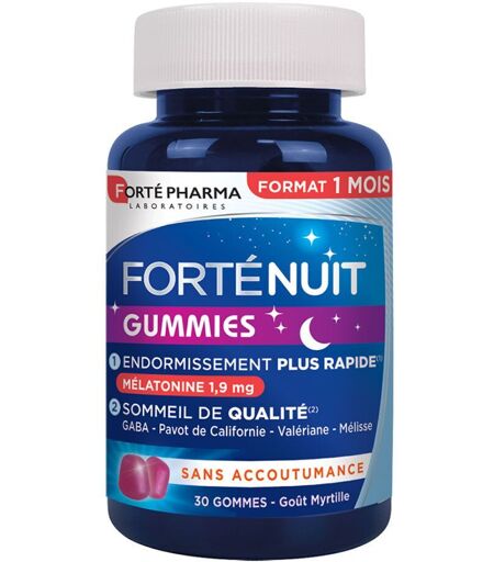 Complément alimentaire à utiliser dans le cadre d’une alimentation variée, équilibrée et d’un mode de vie sain.Des gummies pour de douces nuits !Avec leur bon goût de mûre, les Forté Nuit Gummies vous aident à accélérer votre temps d'endormissement et à améliorer la qualité de votre sommeil.Formulés à base de mélatonine et de plantes, ils vous aident à dire stop aux nuits compliquées pour laisser place à un sommeil plus réparateur.Une solution pratique, sans eau, efficace et sans accoutumance !Le sommeil est indispensable pour le bon fonctionnement de notre organisme. Pour éviter de mauvaises nuits, Forté Nuit Gummies vous aide à faciliter votre endormissement grâce à la mélatonine et à améliorer la qualité de votre sommeil grâce au pavot de Californie présent dans la formule.De la mélatonine et des plantes pour mieux dormirAvec sa formule au dosage élevé à 1,9 mg en mélatonine complétée par de la Valériane, du pavot de Californie, du Tilleul et de la Mélisse, Forté Nuit Gummies vous aide à retrouver un sommeil de qualité.Une galénique qui allie plaisir et efficacitéAvec une seule gomme par jour, pratique et au bon goût de mûre, Forté Nuit Gummies se prend sans eau, juste avant le coucher. Notre gomme est d'origine végétale (pectine de fruits) et sans sucre ajouté** (10,7kcal soit un demi abricot) !De plus, les Forté Nuit Gummies sont sans accoutumance. **Contient des sucres naturellement présents : fructo-oligosaccharides (FOS).IngrédientsFructooligosaccharides, eau, agent gélifiant (pectine), extrait de pavot de Californie (Eschscholzia californica Cham.), acidifiant (acide citrique), extrait de valériane (Valeriana officinalis L.), acide gamma-aminobutyrique, extrait de mélisse (Melissa officinalis L.), extrait de tilleul à petites feuilles (Tilia cordata Mill), colorant (anthocyanes), correcteur d’acidité (citrate trisodique), huile végétale, arôme naturel, mélatonine, anti-agglomérant (cire de carnauba)Valeurs nutritionnelles Pour 1 gommeÉquivalent planteExtrait de pavot de Californie (Eschscholzia californica Cham.)50 mg150 mgExtrait de valériane (Valeriana officinalis L.)25 mg75 mgAcide gamma-aminobutyrique20 mg -Extrait de mélisse (Melissa officinalis L.)-40 mgExtrait de tilleul à petites feuilles (Tilia cordata Mill)-40 mgConseils d'utilisation1 gomme à mâcher 1 fois par jour. 1/2 heure avant le coucher.Précautions d'emploiTenir hors de portée des jeunes enfants. Ne pas dépasser la dose journalière conseillée. Un usage prolongé est déconseillé. Déconseillé aux femmes enceintes et allaitantes et aux enfants de moins de 12 ans sans avis médical. Ne pas conduire de véhicule ou utiliser de machine dans les 4 ou 5 heures suivant la prise de mélatonine. N’hésitez pas à demander conseil à votre pharmacien. Ce complément alimentaire n’est pas un médicament. En cas de prise de médicaments (antidépresseurs, somnifères et autres sédatifs, ...) ne pas consommer sans avis médical.A conserver dans un endroit sec et frais et à l’abri de la lumière,... ...