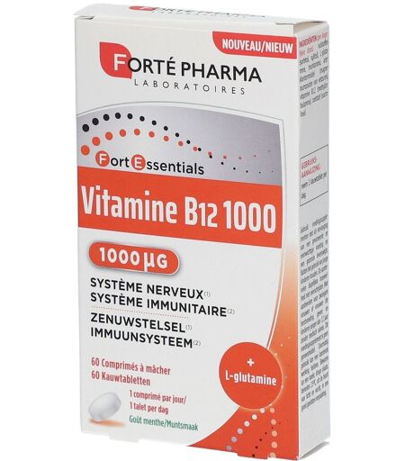 Complément alimentaire à utiliser dans le cadre d’une alimentation variée, équilibrée et d’un mode de vie sain.Le département Recherche & Développement des Laboratoires Forté Pharma a mis au point une formule à base de vitamine B12 (1000 µg) sous forme de méthylcobalamine associée à 50 mg de L-glutamine.Vitamine B12 1000 est un complément alimentaire qui contribue à un fonctionnement normal des systèmes nerveux et immunitaire.Vitamine B12 1000 contribue également à des fonctions psychologiques normales et à réduire la fatigue.Composition: Agents de charge (sorbitol, xylitol), L-glutamine, arôme menthe, antiagglomérant (sels de magnésium d'acides gras), vitamine B12 (méthylcobalamine), édulcorant (sucralose).Valeur nutritionnelle: Pour 1 comprimé % AJR* Vitamine B12 1000 µg 40000 % L-glutamine 50 mg Conseil d'utilisation: Prendre 1 comprimé à mâcher par jour.Précautions d'emploi: Conserver hors de portée des enfants, à température inférieure à 25°C et à l’abri de l’humidité. Ne pas dépasser la dose journalière conseillée.Poids net: 17 g = 60 comprimésFabricant: Laboratoires Forté Pharma 41 avenue Hector Otto98000 Monaco ...