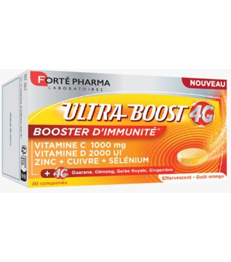 Complément alimentaire à utiliser dans le cadre d’une alimentation variée, équilibrée et d’un mode de vie sain.Forté Pharma Ultra Boost 4G Immunité est un complément alimentaire à base du complexe 4G (ginseng, guarana, gelée royale, gingembre), enrichi en vitamines et minéraux. Il soutient les défenses immunitaires grâce à la vitamine C (1000 mg), la vitamine D, le zinc, le cuivre et le sélénium. Les vitamines B6, B9 et B12 aident à réduire la fatigue. Saveur orange. Sans sucre.IngrédientsCorrecteurs d’acidité (acide citrique, carbonates de sodium), vitamine C (acide L-ascorbique), fructose, agent de charge (sorbitol), arôme orange, amidon de maïs, citrate de zinc, extrait de guarana (Paullinia cupana) (33,5 mg, équivalent plante 100 mg), sélénite de sodium, colorant (bêta-carotène), vitamine D3 (cholécalciférol), extrait de ginseng (Panax ginseng) (13,35 mg, équivalent plante 20 mg), édulcorants (sucralose, glycosides de stéviol, cyclamate de sodium, acésulfame de potassium, saccharinate de sodium, néohespéridine DC), gelée royale lyophilisée (6,67 mg, équivalent 20 mg de gelée royale fraîche), extrait de gingembre (Zingiber officinale) (5 mg, équivalent plante 20 mg), vitamine B12 (cyanocobalamine), sulfate de cuivre, vitamine B6 (chlorhydrate de pyridoxine), agent anti-mousse (polysiloxane), vitamine B9 (acide folique).Valeurs nutritionnelles Pour 1 comprimé%VNR* Vitamine B61,4 mg100% Vitamine B9200 µg100% Vitamine B122,5 µg100% Vitamine C1000 mg1250% Vitamine D350 µg1000% Cuivre1000 µg100% Sélénium105 µg191% Zinc10 mg100% *VNR = Valeurs Nutritionnelles de RéférenceConseils d'utilisationAdultes : 1 comprimé effervescent par jour.Adolescents et enfants de plus de 12 ans : ½ comprimé par jour.À diluer dans un verre d’eau (200 ml), de préférence le matin.Précautions d'emploiContient 7 mg de caféine par dose journalière. Déconseillé aux femmes enceintes, allaitantes et aux enfants. Ne pas utiliser en cas d’allergie aux produits de la ruche, d’asthme ou de terrain atopique. Déconseillé aux personnes suivant un traitement antidiabétique. Ne pas dépasser la dose recommandée. Conserver à l’abri de la chaleur ( ...