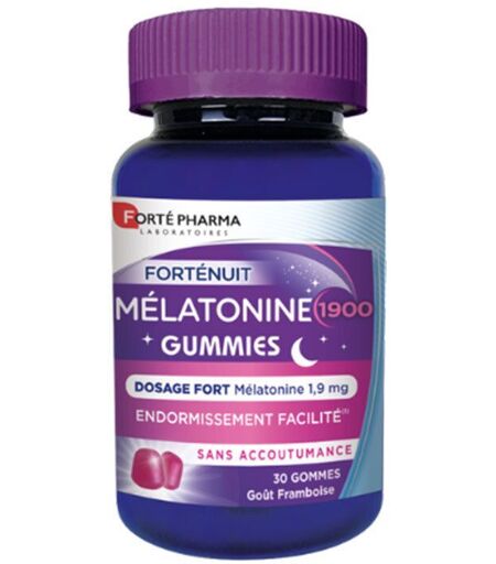 Complément alimentaire à utiliser dans le cadre d’une alimentation variée, équilibrée et d’un mode de vie sain.Des gummies pour bien dormir ! Vous rencontrez des problèmes pour vous endormir ? Vous partez en voyage et vous souhaitez éviter le jetlag ? Nos gummies Forté Nuit Mélatonine 1900, au bon goût framboise et hautement dosées en mélatonine vous aideront à accélerer votre temps d'endormissement pour de douces nuits.Le sommeil peut être perturbé pour diverses raisons : lumières bleues, rythme de vie, alimentation, activités sportives en fin de journée, décalage horaire.. La production de mélatonine, naturellement présente dans notre organisme et appelée hormone du sommeil peut être altérée et engendrer des difficultés d'endormissement.Avec nos délicieuses Forté Nuit Mélatonine 1900 gummies, passez enfin de bonnes nuits !Grâce à sa teneur en mélatonine dosée à 1,9mg, nos gommes favorisent un endormissement plus rapide* et aident à atténuer les effets du décalage horaire*.Une galénique pratique, nomade et efficace ! Au bon goût framboise et sans sucres.IngrédientsÉdulcorants (maltitol, sorbitol), eau, agent gélifiant (pectine), acidifiant (acide citrique), correcteur d’acidité (citrate trisodique), colorant (anthocyanes), huile végétale(Cocos nucifera L.), arôme naturel, mélatonine (1,9 mg), anti-agglomérant (cire de carnauba).Conseils d'utilisation1 gomme à mâcher, 1 fois par jour, 30 min avant le coucher.Précautions d'emploiUn complément alimentaire ne doit pas se substituer à une alimentation variée et équilibrée et à un mode de vie sain. Tenir hors de portée des jeunes enfants. Ne pas dépasser la dose journalière conseillée. Une consommation excessive peut avoir des effets laxatifs. Déconseillé aux femmes enceintes et allaitantes et aux enfants de moins de 12 ans sans avis médical. Ne pas conduire de véhicule ou utiliser de machine dans les 4 ou 5 heures suivant la prise de mélatonine. Ce complément alimentaire n’est pas un médicament. En cas de prise de médicaments (antidépresseurs, anti-épileptiques, somnifères et autres sédatifs, ...) ne pas consommer sans avis médical. Un usage prolongé est déconseillé.Poids net30 gummiesAdresse du FabricantLaboratoires Forté Pharma SAM41 avenue Hector Otto, le Patio Palace98000 MONACO ...