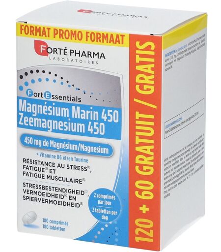 Stress ? Fatigue ? Fatigue musculaire ? Pour réagir dès les premiers signes d’un déficit d’apport en magnésium, les Laboratoires Forté Pharma ont mis au point Magnésium Marin 450. Sa formule contient du magnésium hautement dosé et extrait de l'eau de mer qui permet de contribuer à la résistance au stress(1), de réduire la fatigue(2) et la fatigue musculaire(3).Elle est renforcée par de la vitamine B6, ainsi que de la taurine.(1)Le magnésium contribue au fonctionnement normal du système nerveux et à des fonctions psychologiques normales. (2)La vitamine B6 contribue à réduire la fatigue. (3)Le magnésium contribue à une fonction musculaire normale.Contenu180 comprimés ...
