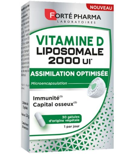 Complément alimentaire à utiliser dans le cadre d’une alimentation variée, équilibrée et d’un mode de vie sain.La vitamine D est connue pour être la vitamine du soleil ! Elle aide à soutenir nos défenses immunitaire, et contribue aussi à la croissance et à la bonne santé des os. Ici sous forme liposomale, elle est mieux absorbée assimilée par notre corps qu'une vitamine D classique.Pour préserver le système immunitaire, la vitamine D3 présente un réel intérêt. La vitamine D est fabriquée par notre organisme, nous la puisons notamment grâce au soleil, et dans notre alimentation. Ainsi en en hiver l’absence de soleil impacte l’efficacité de nos défenses.Notre Vitamine D Liposomale apporte en une gélule par jour, 2000 UI (équivalent à 50 µg) en vitamine D3, soit 1000% des valeurs nutritionnelles de référence (VNR) pour la journée. Sa forme liposomale est un vrai atout : elle protège l'actif et permet de pénétrer efficacement les tissus de notre organisme. Ainsi, la forme liposomale constituée de lipides, permet une assimilation optimisée de la vitamine D par l’organisme.- La forme liposomale protège la vitamine D de l’acidité gastrique- elle facilite l’absorption de la vitamine D par l’intestin, pour la libérer dans l'organisme- elle augmente la biodisponibilité de la vitamine D dans l’organismeAinsi grâce au liposome qui la protège, la vitamine D arrive jusqu’à la cellule cible de façon certaine , et sans être altérée !Ce produit convient aux enfant dès 10 ans.Pour nous aider à affronter les changements de saison et pendant l’hiver lorsque le soleil se fait discret, donnez un petit coup de pouce à votre organisme avec la vitamine D liposomale. En effet, la vitamine D contribue au fonctionnement normal du système immunitaire.La vitamine D contribue également au maintien d’une ossature normale, favorisant ainsi la croissance, et des dents et os solides.Une gélule par jour contient 50 µg de vitamine D, soit 1000% des apports recommandés pour la journée (VNR).IngrédientsComplexe de vitamine D liposomale (maltodextrine, émulsifiants (glycérol, lécithine de tournesol), cholécalciférol (vitamine D3)), maltodextrine, enveloppe de la gélule (hydroxypropylméthylcellulose), antiagglomérants (phosphates de calcium, carbonate de magnésium, sels de magnésium d’acides gras).Valeurs nutritionnellesTeneur en vitamine1 gélule% VNR**Vitamine D3 50 µg1000 %Conseils d'utilisation1 gélule, 1 fois par jour avec un grand verre d'eau (200ml), de préférence le matin.Précautions d'emploiA partir de 10 ans. Un complément alimentaire ne doit pas se substituer à une alimentation variée et équilibrée et à un mode de vie sain. Tenir hors de portée des jeunes enfants. Ne pas dépasser la dose journalière conseillée. Il est recommandé aux femmes enceintes et allaitantes de prendre conseil auprès d’un professionnel de santé avant toute supplémentation. Déconseillé aux enfants de moins de 10 ans, sans avis médical. Ce complément alimentaire n’est pas un médicament. En cas de surdosage... ...