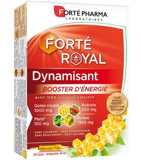 Complément alimentaire à utiliser dans le cadre d’une alimentation variée, équilibrée et d’un mode de vie sain.Forté Royal Dynamisant est une solution CONCENTREE et NATURELLE pour booster votre énergie et renforcer vos défenses en même temps(1)(2)Gelée Royale et Pollen, deux concentrés nutritifs issus de la ruche, agissent en SYNERGIE avec deux actifs d'origine naturelle à l'efficacité reconnue, le Maté et l'Acérola.(1) Le maté préserve votre énergie.(2) Le pollen associé à la gelée royale aide à renforcer les défenses immunitaires.Composition:Eau Purifiée, Jus concentré de Poire, Extrait aqueux de pollen (1350 mg équivalent à 270 mg de pollen) , Gelée Royale (1000 mg), jus concentré d'acérola ( Malpighia glabra L.) (200 mg), extrait sec de maté ( Ilex Paraguariensis) (100 mg), arôme naturel abricot.Valeur nutritionnelle: Pour 1 ampoule Extrait aqueux de pollen- équivalent de pollen1350 mg270 mgGelée Royale 1000 mgJus concentré d'acérola ( Malpighia glabra L.) 200 mgExtrait sec de maté ( Ilex Paraguariensis)100 mgConseil d'utilisation:1 ampoule de Forté Royal Dynamisant à boire le matin diluée dans un verre d'eau ou de jus de fruits.Agiter avant emploi.Précautions d'emploi:Se conformer aux conseils d’utilisation. Ne pas dépasser la dose journalière conseillée. Tenir hors de portée des jeunes enfants. Contient de la caféine (8 mg par dose journalière), déconseillé aux enfants et aux femmes enceintes ou qui allaitent. A conserver à une température inférieure à 25°C et à l'abri de l'humidité.Poids net:20 ampoules de 10 mlFabricant:Forté Pharma6 Font Saint-Landry1120 BruxellesBelgique ...