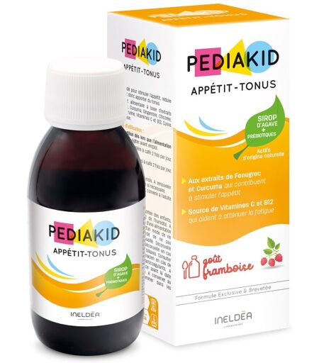 Pediakid® Appétit-Tonus : Complément alimentaire enfants dès 4 mois ! Complément alimentaire enfant naturel à base d'extraits de Fenugrec, Curcuma, Gingembre, Chicorée, Cresson, Spiruline, Vitamines C et B12, Cuivre et Manganèse. Pediakid® Appétit-Tonus est un complément alimentaire à base d'extraits naturels qui aide à : Stimuler l'appétit des enfants Favoriser la prise de poids Réduire la fatigue et améliorer le tonus quotidien La formule exclusive de Pediakid® Appétit-Tonus associe Fenugrec, Curcuma, Spiruline, Chicorée, Cresson, Gingembre, Vitamines C et B12, Cuivre et Magnésium. Sa formule douce et parfaitement assimilable est idéale pour retrouver naturellement et en toute circonstance de la vitalité au quotidien. Le + produit : Tous les sirops Pediakid® sont formulés à base de Sirop d'Agave et de fibres d'Acacia prébiotiques Le Sirop d'Agave est un sucre d'origine végétale : son index glycémique est plus faible que celui d'autres sucres raffinés, et il est également moins cariogène. Les Fibres d'Acacia : très bien tolérées par les enfants, elles favorisent la croissance des bonnes bactéries de l'intestin. Conditionnement : Flacon de 125 ml en étui - Sirop au concentré naturel de framboise. ...