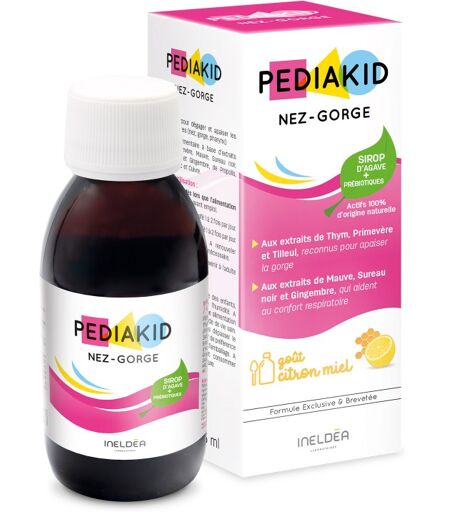 PEDIAKID® Nez-Gorge : Dès 4 mois Un soutien naturel aux défenses immunitaires de l'enfant Nos systèmes immunitaires sont sollicités en permanence. Le mode de vie moderne affaiblit nos défenses naturelles : sommeil perturbé, rythme scolaire, alimentation déséquilibrée et trop pauvre en fruits et légumes… La pollution et les traitements à répétition accentuent ce phénomène. Les défenses immunitaires de l'enfant, encore immatures, sont d'autant plus mises à rude épreuve et ont parfois besoin d'un coup de pouce. Plusieurs facteurs peuvent affaiblir les défenses de l'organisme de l'enfant. La vie en collectivité de plus en plus précoce favorise la transmission des germes. L'arrivée de l'hiver et la baisse des températures, l'humidité et le vent mettent le corps à rude épreuve. L'organisme est plus fatigué et donc sujet aux agents extérieurs. La prise de compléments alimentaires d'origine naturelle permet de soutenir les défenses de l'organisme pour affronter l'hiver au mieux et limiter la transmission des germes tout au long de l'année. PEDIAKID® Nez-Gorge est un complément alimentaire sous forme de sirop à base d'extraits de Thym, Primevère, Mauve, Sureau noir, Tilleul, Acérola, Gingembre ; Propolis, Vitamine C, Zinc et Cuivre. PEDIAKID® Nez-Gorge réunit des actifs naturels : Le Thym, la Primevère et le Tilleul apaisent la gorge. La Mauve, le Sureau noir et le Gingembre améliorent le confort respiratoire. La Vitamine C et le Cuivre participent au fonctionnement du système immunitaire, garant de bonnes défenses naturelles, ce qui est particulièrement important en hiver, saison propice au confinement. Le + produit : Tous les sirops Pediakid® sont formulés à base de Sirop d'Agave et de fibres d'Acacia prébiotiques Le Sirop d'Agave est un sucre d'origine végétale extrait de la sève de cactus, les agaves, qui poussent sur les sols volcanique du Mexique, plus doux et moins épais que le miel. Il est constitué de sucres naturels, non raffinés, ce qui lui confère des qualités nutritionnelles spécifiques : son index glycémique est plus faible que celui d'autres sucres raffinés, et il est également moins cariogène. Les Fibres d'Acacia renforcent les bénéfices du nectar d'Agave : très bien tolérées par les enfants, elles favorisent la croissance des bonnes bactéries de l'intestin. Conditionnement : Sirop en flacon de 125ml ou 250 ml - Goût : Aromatisé au miel et au concentré naturel de citron. ...