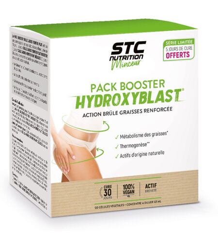 PACK BOOSTER HYDROXYBLAST : Programme brûle-graisses 30 jours renforcé Ce pack se compose de : 1 X Hydroxyblast Booster 1 X Hydroxyblast Gélules Etape 1 : Détoxifier et drainer pour mieux éliminer les graisses Votre programme minceur démarre par l'association de l'Hydroxyblast Booster et Hydroxyblast gélules. La détox est une étape essentielle au démarrage de tout programme minceur puisqu'elle libère l'organisme des toxines, lui permettant ainsi de mieux fonctionner. Le matin, Hydroxyblast Booster contribue ainsi à drainer (extraits de Bruyère, Vigne rouge, Olivier) et à détoxifier l'organisme (extraits d'Ortie et de Fenouil). Son action est complété par Hydroxyblast gélules, aux extraits de Thé vert et Guarana, extraits de plantes connues pour stimuler la thermogénèse. Ce processus favorise la dégradation des graisses pour la production d'énergie. Etape 2 : Brûler activement les graisses La détox terminée, Hydroxyblast gélules peut poursuivre son action brûle-graisses de manière optimale. Hydroxyblast gélules contient également de l'extrait de Gymnema qui favorise la sensation de satiété. Pour éviter les envies de sucres et aider à réguler l'appétit. Conditionnement : Flacon de 125 ml de HYDROXYBLAST® BOOSTER + 1 pilulier de 120 gélules de HYDROXYBLAST® GÉLULES Cure de 30 jours ...