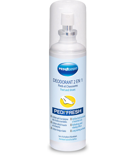 Les mauvaises odeurs de pieds peuvent être réellement désagréables pour vous et votre entourage. Grâce à sa formule unique, PEDIEXPERT PEDI'FRESH neutralise les mauvaises odeurs et apporte fraicheur à vos pieds et à vos chaussures. Composé d'actifs d'origine naturelle (Pierre d'Alun et Huiles essentielles), sans chlorhydrate d'Aluminium, PEDIEXPERT PEDI'FRESH permet efficacité et sécurité : Action antibactérienne et rafraichissante grâce aux huiles essentielles (Sauge, Thym, Arbre à thé, Lavandin et Menthe poivrée) Action anti-transpirante grâce à la Pierre d'Alun Effet longue durée Avec PEDIEXPERT PEDI'FRESH, restez sereins ! ...