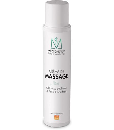 Crème de massage à l'Harpagophytum et actifs chauffants : Pour soulager les douleurs musculaires ! La crème fluide de massage à la formule chauffante MEDICAFARM est idéale pour soulager les douleurs musculaires et aider à la préparation physique. La chaleur, alliée contre les douleurs musculaires : A l'inverse de la cryothérapie, la thermothérapie fait usage de la chaleur pour apporter un soin aux muscles. La chaleur offre un effet vasodilatateur sur la zone traitée. En conséquent, elle contribue à activer la circulation sanguine et donc à améliorer l'oxygénation des muscles, à éliminer rapidement les déchets et à augmenter l'apport en nutriments. En conséquent, le processus de réparation du muscle est accéléré et facilité. Pour faire le choix d'une crème de massage ? Gel, huile, crème de massage… plusieurs alternatives existent pour réaliser un soin. La crème de massage est indiquée pour des massages dits profonds. Sa texture fluide permet de faire pénétrer rapidement et facilement les actifs contenus dans sa formulation dans l'épiderme sans pour autant laisser des résidus à la surface de la peau. Il est important de choisir sa crème de massage en fonction des besoins. La crème de massage à l'Harpagophytum et actifs chauffants MEDICAFARM est idéale dans le cadre de soins de massothérapie dont l'objectif est de soulager les douleurs musculaires et articulaires. La formule de la crème de massage MEDICAFARM : Plusieurs actifs ont été sélectionnés pour leur qualité et leurs bénéfices au niveau musculaire. L'harpagophytum : Cette plante originaire d'Afrique est également connue sous le nom de " Griffe du Diable " à cause de sa forme caractéristique faisant fortement penser à de longues griffes. Elle est utilisée depuis des siècles en phytothérapie pour le soin de nombreux maux et notamment l'arthrose. Cette plante se compose de nombreux actifs dont l'harpagoside, aux propriétés anti-inflammatoires. Elle permet ainsi d'aider à réduire les douleurs articulaires et retrouver de la mobilité. Le capsicum : Plus communément connu sous le nom de piment, il contribue à l'effet chauffant de cette crème de massage pour soulager les tensions musculaires rapidement. Le piment contient de la capsaïcine. Cette dernière aide à réduire la réponse à la douleur de l'organisme et par conséquent la soulager. A qui s'adresse la crème de massage à l'harpagophytum et actifs chauffants MEDICAFARM ? Aux professionnels de santé : Cette crème de massage offre une très bonne glisse et est idéale pour la réalisation de massages thérapeutiques. Elle est particulièrement indiquée dans le cadre de la kinésithérapie sportive. A domicile : Cette crème de massage peut être utilisée en automassage pour aider à soulager les douleurs musculaires et articulaires. Elle est très intéressante pour les sportifs avant la pratique physique pour optimiser l'échauffement et éviter les crampes. Le + produit : Qualité professionnelle : La crème de massage à l'harpagophytum et actifs chauffants... ...
