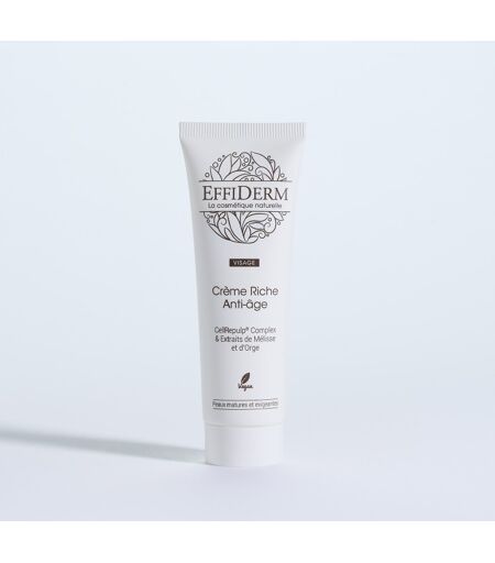 La Crème Riche Anti-âge Effiderm est spécialement formulée pour les peaux matures et exigeantes. L'acide hyaluronique agit en synergie avec l'extrait de Mélisse et d'Orge riche en puissants composés antioxydants pour combattre activement les effets du temps sur la peau délicate du visage. La formule exclusive de la Crème Riche Anti-âge Effiderm contient du CellRepulp ® Complex, un complexe anti-âge exclusif ! Nourrit et hydrate la peau en profondeur Protège des agressions extérieures (pollution...) Combat les effets du vieillissement Illumine le teint Sans parabènes, sans phenoxyéthanol, sans phtalates, sans colorants Tube 50 ml en plastique recyclé. Etui éco-conçu en fibre de papier recyclé. ...