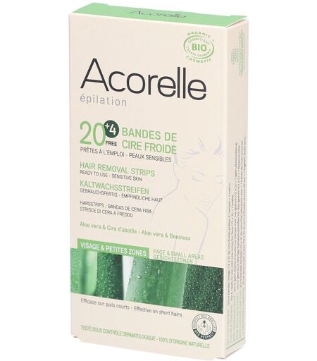 Rapides & faciles à utiliser, les Bandes de cire froide sont vos meilleurs alliés pour une efficacité optimale et une peau lisse jusqu'à 4 semaines. Spécialement conçues pour les contours du visage, leur formule 100% naturelle est parfaitement adaptée à la peau délicate de cette zone. Ultra-pratique & faciles à transporter, ce qui en fait un choix idéal pour les voyages ou les retouches de dernière minute !Bénéfices74% des femmes remarquent une efficacité même sur poils courts (2-5mm)74% des femmes déclarent une épilation parfaite dès la première utilisation95% des femmes assurent avoir une peau douce après l’épilation89% des femmes recommandent nos bandes de cires froides pour les peaux sensibles89% des femmes notent une peau hydratée après l’épilationLes tests consommateurs sont réalisés durant 2 mois sur des consommatrices qui représentent nos clientes. Ainsi on retrouve des femmes à la peau sensible, des femmes qui utilisent régulièrement ce type de produit ou encore des femmes qui ont eu des réactions post-épilation.ApplicationRéchauffer la bande entre les mains. Séparer la bande en 2. Appliquer sur la zone à épiler. Lisser dans le sens des poils. Retirer d’un geste vif à contre-poil. Changer de bande lorsqu’elle est saturée de poils et ne colle plus. Après l’épilation, utiliser une huile comme par exemple l’huile SOS d’Acorelle pour éliminer les éventuels résidus de cire et apaiser sa peau.IngrédientsGLYCERYL ROSINATE, RICINUS COMMUNIS SEED OIL, CERA ALBA*, ARGANIA SPINOSA KERNEL OIL*, HELIANTHUS ANNUUS SEED OIL*, ALOE BARBADENSIS LEAF EXTRACT*.*Ingrédients issus de l’agriculture biologique100% du total des ingrédients est d’origine naturelle10% du total des ingrédients est issu de l’agriculture biologiqueCosmétique écologique et biologique certifié par ECOCERT Greenlife selon le référentiel ECOCERT ...