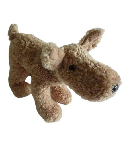 Doudou peluche chien 28 cm environ de hauteur et 38 cm environ de longueur, billes dans les pattes, couleur miel. Etat : Parfait état ...