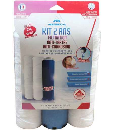 Présentation Kit cartouches Silicophosphates 9'' 3/4 - AquaPhos Pour Anti-tartre Kit 24 mois composé de 2 cartouches 25µ (durée de vie 12 mois chacune) et d'une cartouche anticalcaire 24 mois. Merkur ...