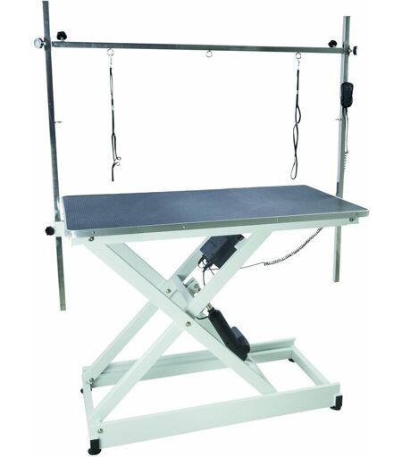 Description générale Table de toilettage à vérin électrique Phoenix Universal 'Jupiter' avec un plateau fixe de 110 x 60 cm. Conçue pour le toilettage de toutes les races de chiens, elle supporte un poids maximum de 100 kg et offre une variation de hauteur de 42 cm à 100 cm. Spécifications techniques Dimensions du plateau : 110 x 60 cm Poids maximum supporté : 100 kg Variation de hauteur : 42 cm (basse) à 100 cm (haute) Plateau revêtu d'un tapis anti-dérapant Ossature en acier traité époxy Piétement en croix avec 2 patins de réglage Compatibilité et accessoires Convient pour toutes les races de chiens Livrée avec 2 sangles Équipée d'une potence double avec 4 points d'attache et 2 crochets pour ciseaux ou tondeuse Installation Montage simple grâce à un piétement en croix stable Ajustement de la hauteur facile avec la commande à main Utilisation Idéale pour le toilettage professionnel ou à domicile Facilité d'entretien grâce au tapis anti-dérapant Utilisation sécurisée avec les sangles ...