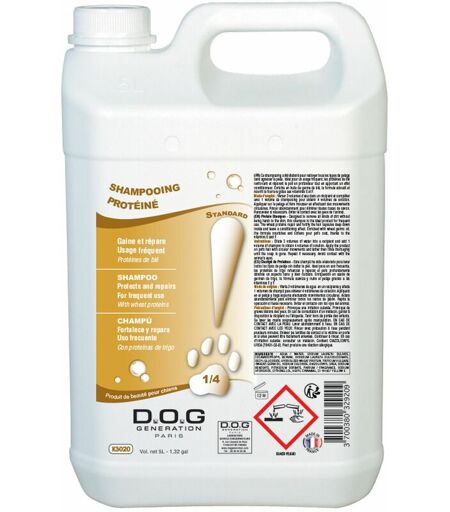 Le shampoing Protéiné Dog Génération est recommandé pour toutes les races de chiens.Idéal pour un usage fréquentLa gamme de shampoing Dog Génération est élaborée sans PARABEN Shampoing Protéiné Dog Génération pour chien Convient pour un usage fréquent Elaboré pour nettoyer tous les types de pelage sans agresser la peau de votre chien Les protéines de blé renforcent et réparent le poil en profondeur Apporte un léger effet conditionneur Enrichie en huile de germe de blé, la formule adoucit et nourrit la fourrure grâce aux vitamines E et F. La gamme de shampoing Dog Génération est élaborée sans PARABEN Conditionnements : 250 ml (K3005), 1 L (K3015), 5 L (K3020) ou 10 L (K3025). "Dangereux. Respecter les précautions d'emploi". Corrosif/irritant pour la peau, Catégorie 2 H315. Lésions oculaires graves/irritation oculaire, Catégorie 1 H318. ...