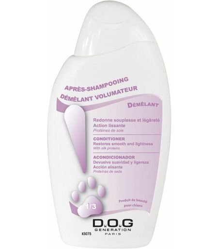 Après-Shampooing pour chien démêlant Volumateur Dog Génération.Spécialement formulé pour les fourrures difficiles et nécessitant du volume, cet après shampoing facilitera le démêlage sans ramollir le poil. Disponible en flacon 250ml et bidons de 1 ou 5 litres. Après-Shampoing volumateur Dog Génération. Après-shampoing démêlant aux protéines de soie à l'action lissante spécialement formulé pour les fourrures difficiles et nécessitant du volume. Texture crème facile rincer. Ne ramollit pas le poil. Sans PARABEN Quel après-shampooing utiliser pour votre animal qui a besoin de volume ? Grâce à la texture crème de l'après shampoing volumateur Dog Génération, la fourrure de votre chien retrouvera sa douceur et sa légèreté et souplesse. Spécialement formulé pur les fourrures difficiles et en manque de volume, cet après sahmpoing à base de protéines de soie lissent les écailles et facilite le démêlage du poil. Idéal pour les races de chien tel que le Caniche, Cocker, Colley, Bichon, Pékinis, ...