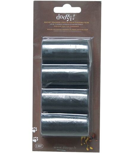Ayez toujours à portée de main des sacs ramasse crottes lors de vos sorties grâce à ce lot de 4 rouleaux.Pratiques, vous pourrez recharger les distributeurs de sachets Doogy et autres distributeurs standard.Vendu en lot de 4 rouleaux de 20 sachets chacun. Lot de 4 rouleaux de 20 sachets ramasse-crottes. Très bon rapport "qualité-prix". Ces lots de sachets ramasse-crottes à petit prix vous permettront de ramasser proprement les déjections de votre animal. S'adapte à tous les distributeurs de sachets standard Couleur des sachets : noir. ...