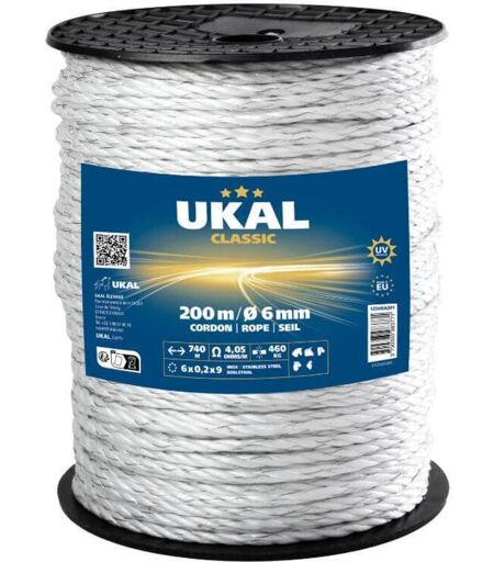 Le cordon blanc de la gamme UKAL CLASSIC se compose de conducteurs en inox de 0,2 mm de diamètre pour une conductivité optimale. Ce cordon offre une distance de gardiennage de 200 m et permet de sécuriser les enclos des chevaux, bovins, ovins, chiens et des volailles. Très résistant, il dispose d'une protection anti-UV pour une meilleure résistance dans le temps. Caractéristiques : Distance : 200 m Diamètre : Ø 6 mm Conducteurs : inox 6 x 0,2 mm + 9 PP Résistance : ohm/m : 4.05 Charge de rupture : 460 kg Fabrication européenne ...