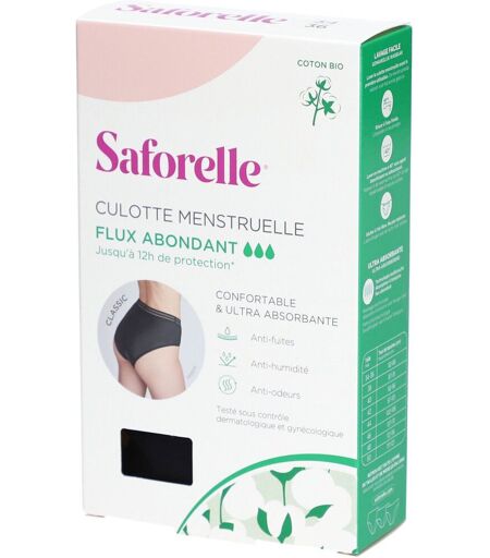 Saforelle Culotte pour les Règles Flux Abondant Taille 34-36La CULOTTE MENSTRUELLE SAFORELLE est naturellement absorbante, pour une utilisation quotidienne de jour comme de nuit. En coton BIO hypoallergénique, le voile en contact avec la zone intime limite les risques d'irritations et d'allergies.Bénéfices Hypoallergénique Étanche Sans odeur Absorption de l'humidité : absorption de 4 tampons en cas de saignements abondants (3 gouttes) Testé cliniquement Coton biologique ApplicationJusqu'à 12 heures de protection. Laver la serviette menstruelle avant la première utilisation. Rincer à l'eau froide. Laver en machine à 40° sans eau de Javel ni assouplissant. Sécher à l'air libre. Ne pas repasser. Ingrédients Culotte: 80% polyamide, 20% élasthanne. Couche absorbante: 95% coton bio, 5% élasthanne. Couche impermeable: 100% polyester enduit de polyurethane. Élastique: 79% polyamide, 21% élasthanne ...