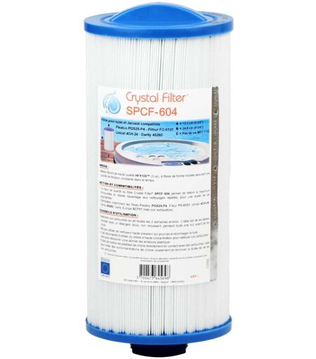 Filtre spa Crystal Filter®, modèle SPCF-604 Compatible Pleatco PGS25-P4 - Filbur FC-0131 - Unicel 4CH-24 - Darlly 40260 - Darlly Europe SC717. Hauteur : 24,80 cm Diamètre : 11,60 cm Conseils d'utilisation du filtre spa Crystal Filter® SPCF-604 Compatible Pleatco PGS25-P4 - Filbur FC-0131 - Unicel 4CH-24 - Darlly 40260 - Darlly Europe SC717 : - Consultez les instructions du manuel de votre système de filtration pour connaître le mode d'élimination de votre filtre. - Nettoyez le filtre toutes les 2 semaines. - Pour retirer les saletés accumulées sur votre filtre, utilisez de l'eau sous pression, avec un tuyau d'arrosage, vous pouvez par exemple utiliser un pistolet ou une lance de jardin. - Les filtres Crystal Filter® peuvent être nettoyés avec les produits détergents domestiques ou un dégraissant non moussant, tels que les détergents pour lave-vaisselle. Les laisser tremper au minimum une heure (si possible toute une nuit). - Pour de meilleurs résultats, il est recommandé d'utiliser 2 ...