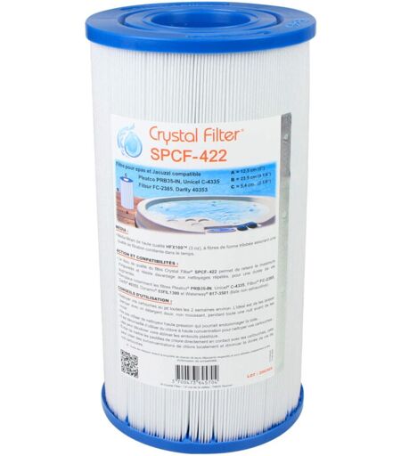 Filtre spa Crystal Filter® SPCF-422 compatible Pleatco PRB35-IN - Filbur FC-2385 - Unicel C-4335 - Darlly 40353 - Darlly Europe DL705 Hauteur : 23.50 cm Diamètre : 12.50 cm conditionnement = 1 Conseils d'utilisation du filtre Crystal Filter® SPCF-422 compatible Pleatco PRB35-IN - Filbur FC-2385 - Unicel C-4335 - Darlly 40353 - Darlly Europe SC705 : - Consultez les instructions du manuel de votre spa pour connaître le mode d'élimination de votre filtre. - Nettoyez le filtre toutes les 2 semaines. - Pour retirer les saletés accumulées sur votre filtre, utilisez de l'eau sous pression, avec un tuyau d'arrosage, vous pouvez par exemple utiliser un pistolet ou une lance de jardin. - Ce filtre peut être nettoyé avec les produits détergents domestiques ou un dégraissant non moussant, tels que les détergents pour lave-vaisselle. Le laisser tremper au minimum une heure (si possible toute une nuit). - Pour de meilleurs résultats, il est recommandé d'utiliser 2 cartouches en alternance. Cela ...