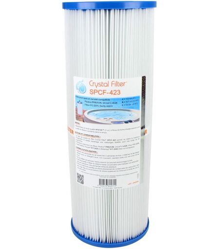 Filtre spa Crystal Filter® SPCF-423 compatible Pleatco PRB25-IN - Filbur FC-2375 - Unicel C-4326 - Darlly 42513 - Darlly Europe SC704 Hauteur : 33.7 cm Diamètre : 12.5 cm conditionnement = 1 Filtre spa Crystal Filter® SPCF-423 compatible Pleatco PRB25-IN - Filbur FC-2375 - Unicel C-4326 - Darlly 42513 - Darlly Europe SC704 : Ce modèle de filtre est l'un des plus communément utilisés pour la filtration des spas, jacuzzis, bains à remous... Conseils d'utilisation du filtre spa Crystal Filter® SPCF-423 compatible Pleatco PRB25-IN - Filbur FC-2375 - Unicel C-4326 - Darlly 42513 - Darlly Europe SC704 : - Consultez les instructions du manuel de votre spa pour connaître le mode d'élimination de votre filtre. - Nettoyez le filtre toutes les 2 semaines. - Pour retirer les saletés accumulées sur votre filtre, utilisez de l'eau sous pression, avec un tuyau d'arrosage, vous pouvez par exemple utiliser un pistolet ou une lance de jardin. - Ce filtre peut être nettoyé avec les produits détergents ...