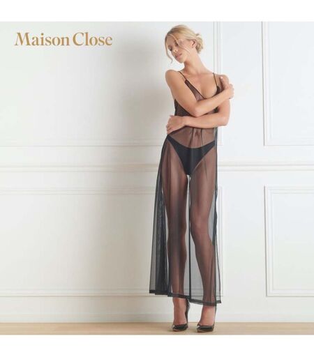 Maison Close frappe à nouveau avec une nouvelle collection très chic et élégante. Madame rêve, est d’abord et à jamais la voix bleue nuit d’Alain Bashung qui poétise le désir féminin sur une orchestration somptueuse. Vêtue tout de noir et de tulle la Collection Madame Rêve laisse à penser que son charme aura son effet sur vous… et sur votre partenaire. Laissez-vous évaporer dans les rêves érotiques de cette femme à la beauté froide... La matière chic et romantique qu’est le tulle saura révéler vos atouts de séductrice mélangée au côté obscur de la couleur noire pour réveiller votre âme provocatrice. Cette collection de la Ligne Personnelle laisse ici toute la place à l'imagination et joue sur une lecture à double sens. Aussi libre que pudique aussi feutrée et délicate que les pas d’une féline sur une moquette de velours... L’inspiration découle de l’imagination fantasmagorique de cette célèbre chanson au phrasé si intime et singulier. D’un trait ombré Monsieur le Français rend hommage à ce grand Artiste avec une précision qui est le propre de l’art des ritournelles ... Optez pour la délicieuse robe longue Madame Rêve en tulle extensible transparente noire fendue sur les côtés. Les liens réglables dans le dos ornés de bijoux dorés apportent une touche très élégante. Cette robe dévoilera totalement votre dos ainsi que votre décolleté en un col rond pour rendre votre partenaire fou de désir. Composition : 100% Polyester. Tailles S/M, L/XL. ...