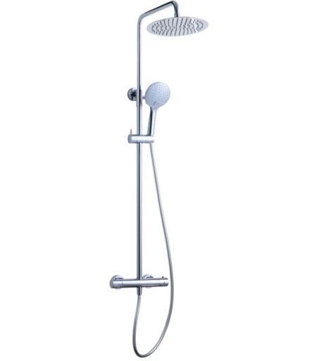 Points forts Hauteur réglable Design élégant Robinetterie 100% laiton Garantie : 5 ans Caractéristiques Mitigeur thermostatique laiton corps froid Colonne de douche métal télescopique sur 390 mm Hauteur totale : 1 280 mm Hauteur sous pomme : 1 155 mm maxi – 890 mm mini Douche de tête Ø 250 mm métal (inox poly) Avec picots anticalcaire, version extra-plate Douchette à main 3 jets ABS et anticalcaire Changement de jets push open Flexible Silverflex 1,50 m antitorsion Dimensions Longueur du mitigeur douche thermostatique : 26,7 cm Longueur du bras de douche horizontal : 35 cm Dimensions de la douche de tete : 25 cm ...