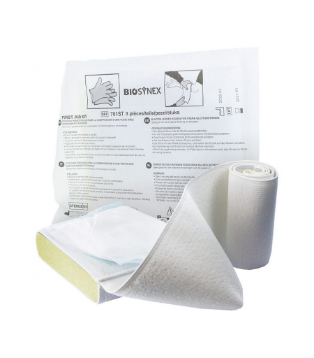 Ce coussin de compression a été développé pour substituer la compression manuelle habituellement réalisée par un secouriste s'il y a hémorragie. Il se compose d'une bande élastique dotée d'une extrémité repliée, à l'intérieur de laquelle se trouvent un morceau de mousse et un coussinet compressif attaché par un adhésif (ces derniers absorbent le sang). Une fois placés sur la blessure, ces éléments sont enveloppés autour du membre en appliquant une tension sur la bande élastique. Celle-ci est maintenue en place grâce à un système de bandes Velcros. Dimensions : Compresse : 10 x 10 cm. Bande : largeur 10 cm, longueur 80 cm. ...