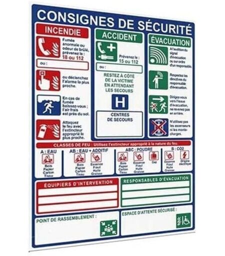 Panneau de signalétique des consignes de sécurité (format portrait): Les consignes de sécurité concernant l'incendie font partie intégrante des mesures de prévention techniques et organisationnelles à mettre en place dans un établissement. Pour les établissements réunissant plus de 50 personnes où sont manipulées et fabriquées des matières inflammables, la signalétique de ces consignes de sécurité est obligatoire et elle est, néanmoins, fortement recommandée pour les autres établissements. Conforme aux normes à la norme NF S 60-303 , ce panneau dispose des consignes suivantes : - Consignes en cas d'incendie - Consignes en cas d'accident - Consignes en cas d'évacuation , point de rassemblement et espace d'attente sécurisé, renseignement des équipiers d'intervention et des responsables d'évacuation - Consignes du choix de l'extincteur en fonction du type de feu Des espaces de renseignement des différents numéros de téléphone de substitution est possible pour chaque cas de figure (ex: ...