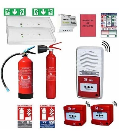 Pack sécurité alarme incendie ERP 2 entrées Ce pack sécurité incendie contient le matériel nécessaire pour équiper les petites PME, les commerces et bureaux de moyenne taille et s'adresse particulièrement aux Etablissement recevant du Public. Ce kit alarme incendie comprend 1 Extincteur à eau 6L ABF, 1 Extincteur CO2 B de 2kg et leurs signalétiques à installer au-dessus de l'extincteur représenté 1 Alarme type 4 radio à pile qui communique avec ses deux déclencheurs manuels par fréquence radio. Comme chaque élément est interconnectable, une pression sur un déclencheur fait systématiquement déclencher la sirène de la centrale type 4, par exemple. 2 Blocs de secours BAES EVACUATION H sont nécessaire pour signaler les issues de secours en cas de coupure de courant ou d'intervention. ils se situent donc juste au-dessus de chaque porte de sortie. 1 Panneau vertical des consignes de sécurité ainsi qu'un registre de sécurité Incendie viennent compléter ce pack Incendie ERP. Ce pack sécurité ...