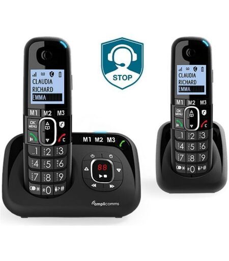 Téléphones fixes DUO répondeur Amplicomms 1582Vous recherchez la sécurité d'un téléphone filaire et la mobilité d'un sans-fil aux fonctionnalités spécialement adaptées à vos besoins ?Nous vous conseillons le nouveau modèle Amplicomms BigTel 1580 ComboLes deux téléphones ultra amplifiés sont équipés d'un très grand écran full graphic de très haute qualité offrant une belle lisibilité avec de gros caractères permettant de lire distinctement les numéros composés, le numéro de l'appelant, les menus en gros...Vous pouvez associer votre téléphone senior avec 3 autres téléphones sans fil.Répondeur : Ce modèle dispose d'un répondeur d'une capacité de 60 mn sur le socle permettant de voir directement le nombre de message et de gérer les messages sans utiliser le combinéSur le socle de ce téléphone senior vous avez accès à :- 3 touches mémoires pour appeler directement des numéros- Le bouton Haut Parleur pour prendre l'appel en mains libres sans prendre le combinéBocage appels indésirables : L'atout majeur du téléphone Amplicomms Bigtel 1580 est la touche VIP permettant de filtrer manuellement ou automatiquement les appels indésirables et ainsi bloquer jusqu'à 100 numéros, vous ne serez plus harcelés au téléphone.Vous pouvez régler le volume du combiné jusqu'à +35 dB directement depuis la touche du côté BOOST ou depuis le menu et la sonnerie de ce téléphone senior jusqu'à +90 dB afin d'améliorer votre confort auditif et rester en contact avec tous vos proches.Le répertoire du téléphone malvoyant contient une touche répertoire directe pouvant contenir jusqu'à 100 contacts.Le volume du haut parleur de très bonne qualité et réglable selon vos besoins.Améliorez donc significativement votre confort au quotidien : les touches sont ergonomiques, grosses et le clavier est simple. Ce téléphone senior dispose des touches rétroéclairées. Les 2 téléphones senior sont dotés de 3 touches mémoires directes pour appeler automatiquement les numéros préenregistrés d'un simple appui sur un des ...