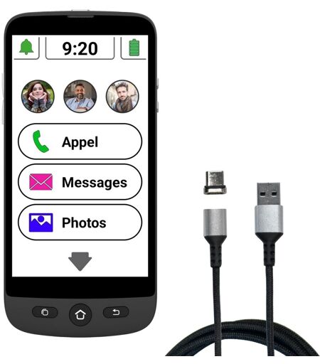 Swissvoice S510-M - Smartphone Senior 4G simplifié Double SIM Touche SOS Fonctions Le Swissvoice S510-M offre une expérience simple et intuitive aux seniors. Son écran d'accueil est clair et lisible, avec de grandes icônes et des raccourcis personnalisables pour accéder facilement aux fonctions essentielles comme les appels, les messages ou encore l'appareil photo. Avec un affichage contrasté et une police agrandie pour un meilleur confort de lecture. Le son est amplifié pour assurer une écoute claire et puissante, idéale pour les personnes malentendantes. Lors des appels, si vous le souhaitez une fonction d'amplification instantanée permet d'augmenter le volume, garantissant une communication fluide et sans effort. Pour plus de sécurité, le téléphone est équipé d'un bouton SOS qui permet, en cas d'urgence, d'alerter rapidement jusqu'à 5 contacts préenregistrés. Une pression sur ce bouton déclenche l'envoi automatique d'un SMS avec la position GPS, permettant ainsi à vos proches de vous localiser immédiatement. Les personnes équipées d'appareils auditifs peuvent également utiliser ce téléphone puisqu'il est certifié HAC (Hearing Aid Compatibility). Cette compatibilité garantit une écoute sans interférence ni bruit parasite, pour des appels clairs et confortables. Grâce à sa connexion 4G et au Wi-Fi, il est possible de passer des appels vidéo et d'envoyer des messages via des applications comme WhatsApp. Son appareil photo de 8 mégapixels permet de capturer des souvenirs et de partager des photos avec ses proches en toute simplicité. Pour un usage encore plus pratique, le Swissvoice S510-M est livré avec une base de recharge. Il suffit de poser le téléphone dessus pour que la batterie se recharge, sans avoir à manipuler de câbles ou de connecteurs compliqués. Un témoin lumineux indique lorsque la charge est en cours. Caractéristiques Ecran 5'' HD, affichage lumineux et contrasté Appareil photo arrière : 8 MP avec autofocus Appareil photo avant : 5 MP Volume amplifié, fonction boost pour appels Compatible aides auditives Batterie : 2500 mAh, autonomie prolongée Recharge : câble USB-C Connectivité : 4G, Wi-Fi, Bluetooth 4.2 Bouton SOS : Envoi d'alertes à 5 contacts avec localisation GPS Double SIM Stockage interne : 16 Go Mémoire extensible Système d'exploitation : Android simplifié Applications préinstallées : WhatsApp, Facebook, YouTube Icônes agrandies, menus simplifiés Touches physiques : Verrouillage, volume, SOS Poids : 160 g Dimensions : 140 x 70 x 10 mm Coloris : Noir Accessoires fournis : câble USB-C, guide utilisateur Que recevez-vous ? Un smartphone Swissvoice S510-M Un câble USB-C Une notice ...