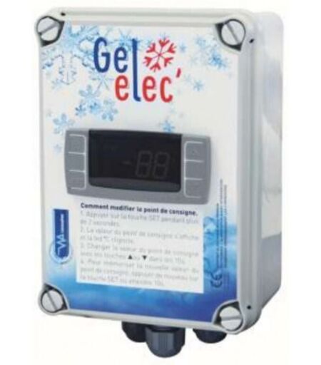 Description du coffret électrique Hors Gel Gelélec. Avec le coffret Gélélec, plus d'inquiétude, que vous soyez présent ou pas, la filtration se met automatiquement en marche dès que la température extérieure descend en dessous de la température de consigne que vous avez programmée. Se place à coté du coffret de programmation et se raccorde sur ce dernier pour enclencher la marche forcée en cas de gel. Son fonctionnement est particulièrement simple : il mesure en permanence la température de l'air grâce à sa sonde de température de haute précision Si la température de l'air ambiant descend sous le seuil donné (à régler entre 0°C et 1°C), il déclenche instantanément la filtration afin d'éviter que l'eau ne gel en surface ou dans les canalisations Caractéristiques Tension d'alimentation 230 volts Afficheur 3 chiffres avec point décimal de la température Point de consigne réglable facilement Sonde avec 1.50 m de câble pouvant être rallongé jusqu'à 15 m Dimensions : 170x120x80 mm avec ...