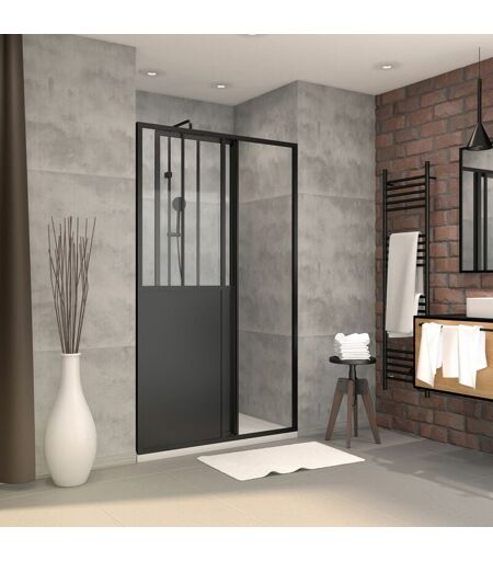 Aurlane - porte coulissante noire mate 'atelier' et receveur à grille linéaire effet pierre - 120x90x200 cm