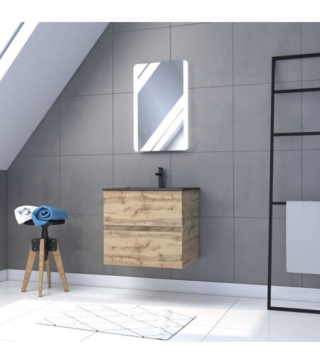 Meuble Salle De Bain 60x54 - Finition Chene Naturel + Vasque Noire + Miroir Led - Timber 60 - Pack08