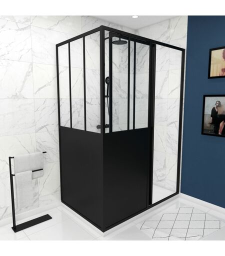 Pack comprenant une Paroi de douche à porte coulissante type atelier WORKSHOP SLIDING 120 + Paroi de retour type atelier WORKSHOP SIDE 80 + receveur en acrylique renforcée blanc effet pierre MOON RECTANGULAR 120/80 Caractéristiques de la paroi WORKSHOP SLIDE 120: Paroi de douche à porte coulissante de type atelier Structure en aluminium laqué noir mat Profilés de fixation muraux ajustables (+ / - 1cm) Porte coulissante type atelier avec une partie en verre trempé 5 mm sur le haut et une partie en aluminium composite de 5mm Poignée en métal laquée noir mat Fermeture magnétique Montage réversible Dimensions: 120x200 cm Référence: FAC352 Caractéristiques de la paroi de retour WORKSHOP SIDE 80: Paroi de douche de retour type atelier Structure en aluminium laqué noir mat Profilés de fixation muraux ajustables (+ / - 1cm) Paroi de retour type atelier avec une partie en verre trempé 5 mm sur le haut et une partie en aluminium composite de 5mm Compatible uniquement avec les parois de la gamme ...