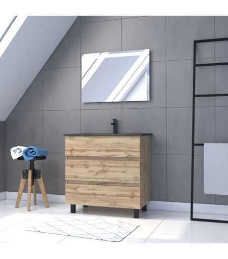 Meuble Salle De Bain 80x80 - Finition Chene Naturel + Vasque Noire + Miroir Led - Timber 80 - Pack18