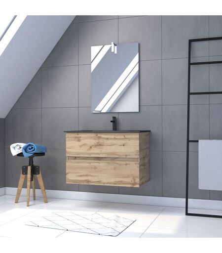Meuble Salle De Bain 80x54 - Finition Chene Naturel + Vasque Noire + Miroir Led - Timber 80 - Pack33
