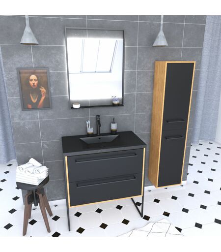 Aurlane - meuble salle de bains 80 cm, vasque noire, miroir led et colonne - chêne et noir - structura